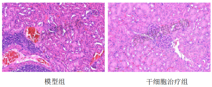 模型组肾组织整体结构紊乱。部分肾小球体积增大,系膜细胞和基质增生,炎症反应剧烈,影响肾功能。治疗组肾组织结构较模型组有明显改善,趋于规则。肾小球病变程度减轻,系膜细胞和基质增生有所缓解,炎细胞浸润数量明显减少,炎症反应得到控制,肾组织功能逐步恢复。此外通过流式检测免疫细胞,进一步证实干细胞对自身免疫的调节修复作用。